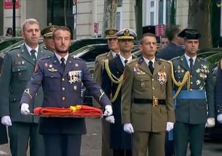La Familia Real ocupó su lugar en la Tribuna Real para dar paso al izado de la Bandera de España. Portada en bandeja de Plata y escoltada por tres miembros de los ejércitos de Tierra, Mar y Aire, más un componente de la Guardia Civil, la bandera hacía su entrada solemne en la Plaza para ocupar su lugar de honor y ser izada y homenajeada.