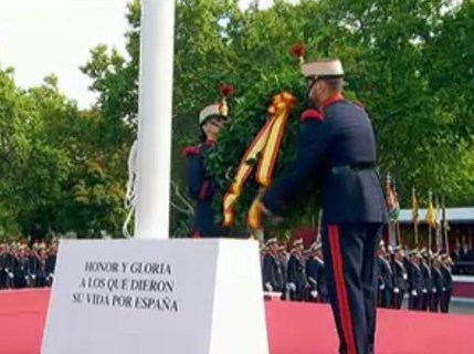 El acto de mayor emoción, convertido en un homenaje a los caídos por España tanto militares como civiles desde hace algunos años, daba comienzo con la entrada de la corona de laurel que Su Majestad el Rey Don Felipe VI depositaria a los pies de la Bandera, por cuyos colores y, por lo que significa la Roja y Gualda de Democracia, libertad, justicia y solidaridad, dieron su vida militares, cooperantes internacionales, misioneros, pero también policías, bomberos, médicos y todo aquel que entrega lo más preciado a los demás. A los sones de «La Muerte no es el final» y entonado por un plaza a rebosar de publico, se rindió el merecido homenaje, al que puso la guinda la Patrulla Aguila que sobrevoló e