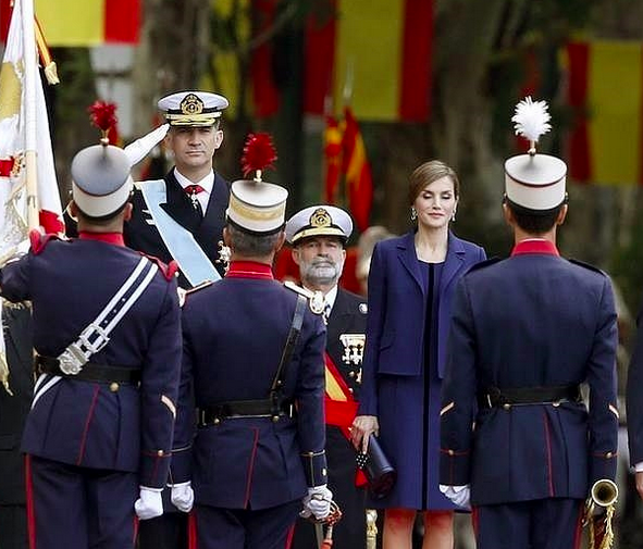 SSMM los Reyes fueron recibidos por el Presidente del Gobierno y el resto de autoridades militares y civiles. Tras los saludos protocolarios, donde pudimos ver como Su Majestad la Reina impartía a las pequeñas Leonor y Sofía un curso avanzado de saludos, el Batallón de Honores de la Guardia Real interpretaba el Himno Nacional en su versión larga, que solamente suena en honor a SM el Rey.