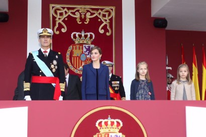Dicen que es cortesía de los Reyes la puntualidad. Ademas de cortesía, es una máxima de la Casa Real, por lo que a las 11 en punto de la mañana, se podían ver a los Lanceros y Coraceros de la Guardia Real enfilando la calle Atocha y escoltando el Rolls Royce en el que SSMM los Reyes llegaban para presidir el acto central de la Fiesta Nacional que, como en los último años, se lleva a cabo en la Plaza Cánovas del Castillo. Tras ellos, el coche que llevaba a las pequeñas de la Familia Real la Princesa de Asturias y la Infanta Leonor, que vivían hoy su segundo desfile del Día de la Fiesta Nacional y de la Hispanidad.