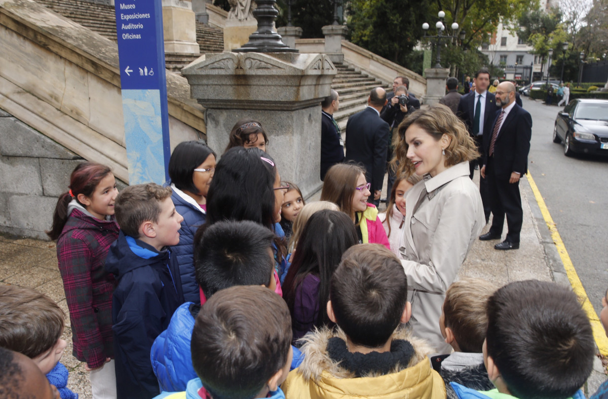 A la salida del acto, la Reina ha podido conversar con un grupo de niños que estaban por las inmediaciones, con los que se ha parado unos instantes.
