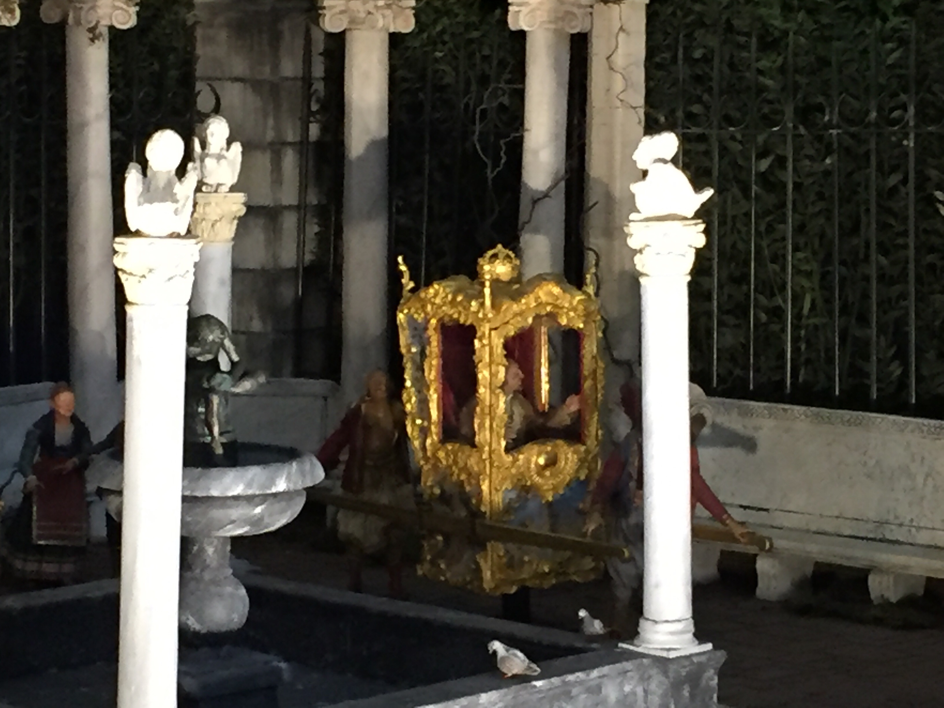 Existe una reproducción del propio zaguán del Palacio Real, que alberga el Misterio, junto con varios templetes, estanques y fuentes, de los Jardines de Aranjuez.