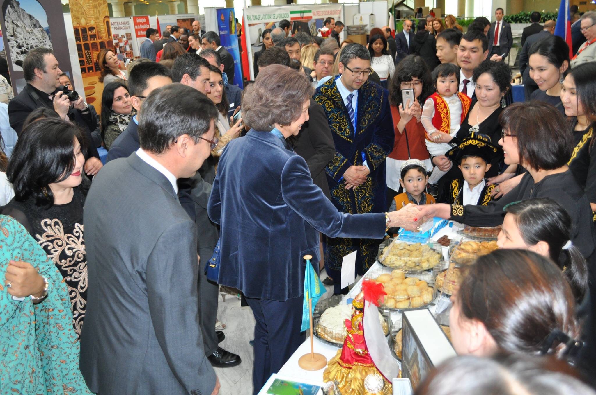 La Reina inició un recorrido por prácticamente la totalidad de las mesas en las que se podía contemplar desde especialidades gastronómicas de los diferentes países participantes hasta joyas, artesanía, vestidos típicos y una amplía variedad de productos.