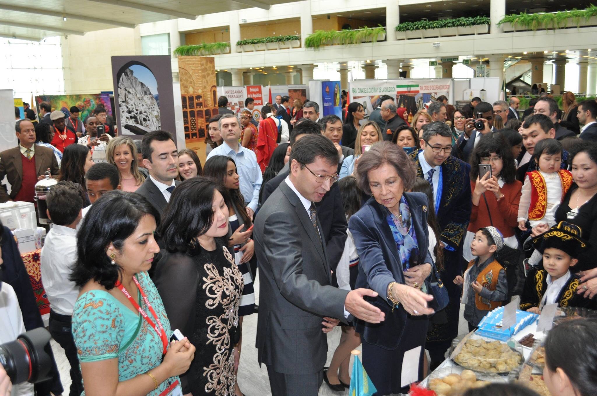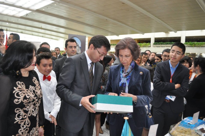 Durante su paseo por los diferentes espacios, la Reina conversó con los representantes de los países, escuchó algunas de las explicaciones que le hicieron de los productos que se exhibían y recibió algunos recuerdos.
