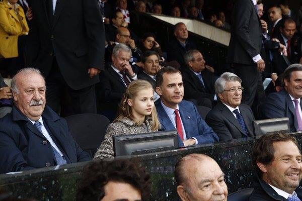 La princesa ha seguido el encuentro con mucha curiosidad, sin parar de preguntar a su padre durante todo el encuentro, y al seleccionador Nacional Vicente del bosque, I Marqués de del Bosque, que estuvo flanqueando a la Princesa todo el partido. Es la primera vez que vemos a la Princesa Leonor fuera de un acto oficial o de los posados en el verano Mallorquín, y también la primera que acude sola con su padre. Da la casualidad, que Don Felipe se estrenó en un acto deportivo precisamente en el Vicente Calderón en un partido Atlético-Real Madrid con 8 años de edad, declarando después del mismo, a preguntas de los periodistas, que era «Del Atlético».