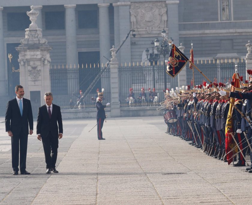 Tras las presentaciones por parte del Rey Felipe VI de las autoridades Españoles, y la que llevó a cabo el Presidente Argentino Macri de las que le acompañaban en este viaje de Estado, las dos parejas presidieron el desfile que se realizó allí por parte de las distintas unidades de la Guardia Real.
