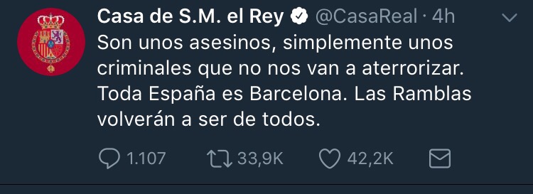 «Son unos asesinos criminales». Con estas contundentes palabras la Casa De SM el Rey ha condenado el cobarde atentado islamista que España ha sufrido en Barcelona, donde una furgoneta conducida por un Islamista ha arrollado en las Ramblas de Barcelona a los viandantes dejando 13 personas asesinadas, más de 100 heridos, de ellos 15 en estado muy grave.