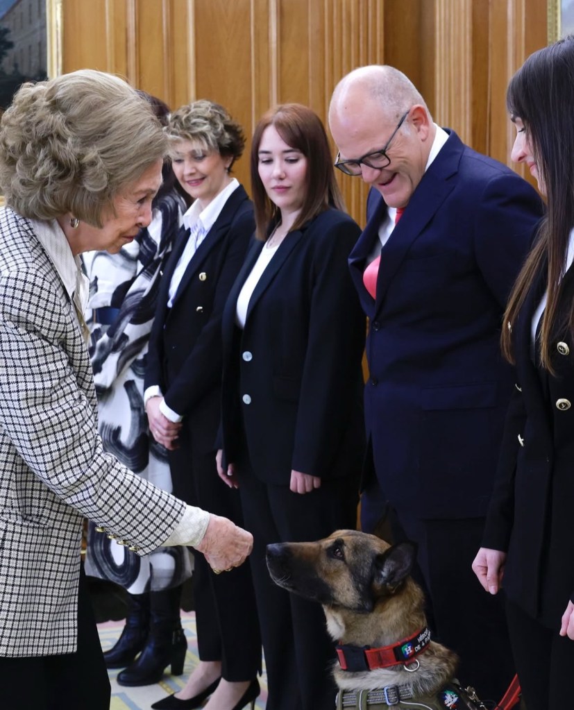 Su Majestad la Reina Sofía recibió en audiencia en el Palacio de La Zarzuela a una representación de la Asociación Héroes de 4 Patas, una organización sin ánimo de lucro dedicada a buscar hogar para perros de trabajo jubilados. La delegación estuvo encabezada por su presidenta, Rosa Chamorro, y contó con la presencia de varios voluntarios y dos canes retirados que han servido en diversas instituciones.
